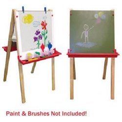 Features: Heavy-duty, children's art easel with solid hardwood legs Adjustable to three different heights Chalkboard on one side and dry-erase board on the other Includes 2 paint trays (tray color may vary) 4 easel clips Specifications: Overall Dimensions: 48" H x 24" W Art Surface: 24" H x 24" W Age Level: For Children 3+ with Adult Supervision Please Note: Accessories sold separately..../ Early Childhood Resources Kid's Outdoor Hardwood Adjustable Floor Easel with Chalkboard and Dry-Erase Board / dry erase board